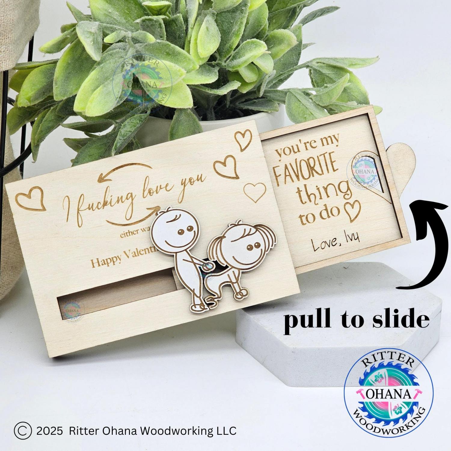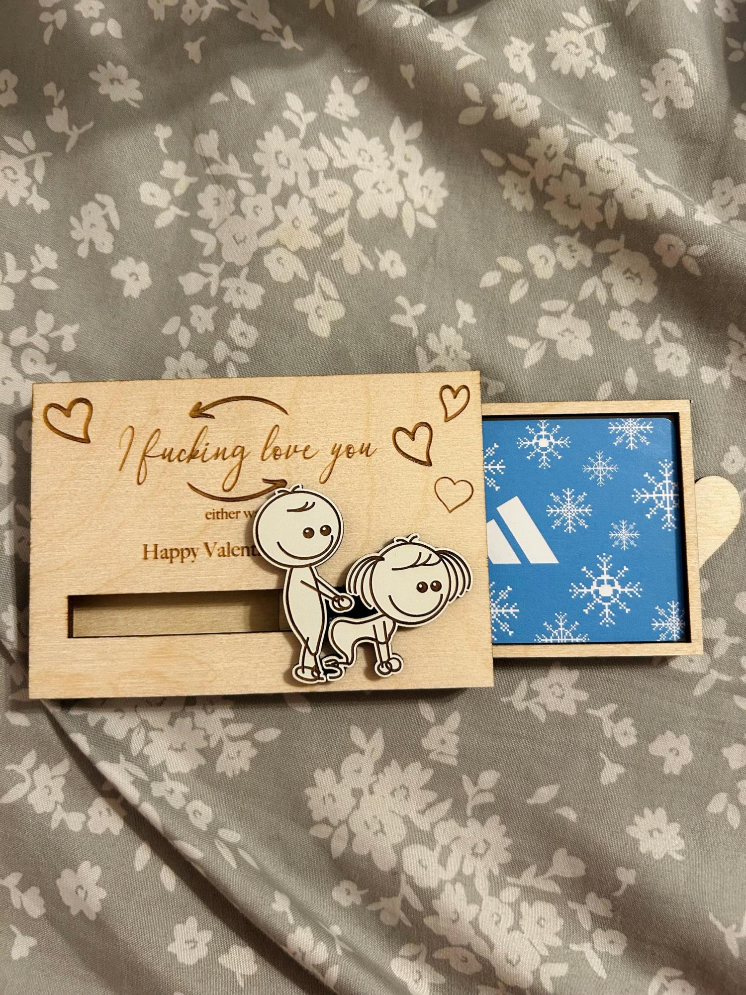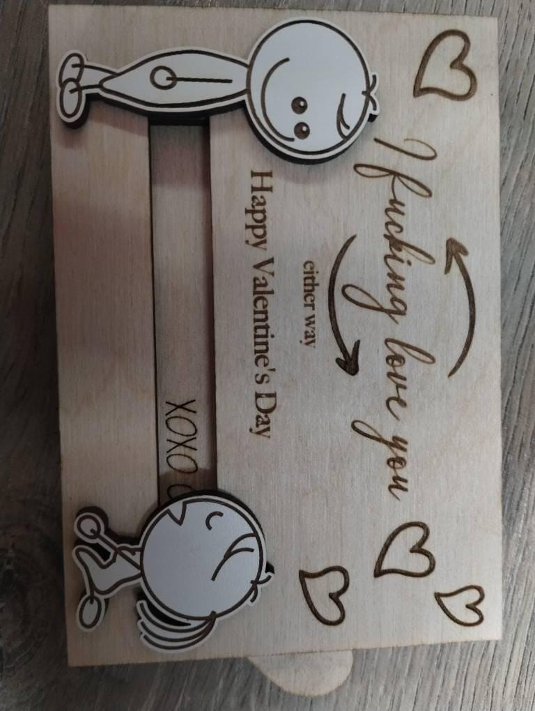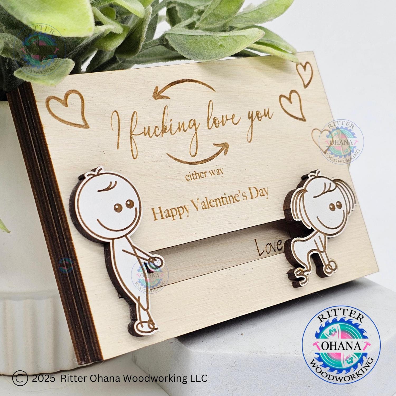 This "inappropriate" Valentine's Day gift card holder adds a touch of playfulness to your Valentine's Day gift with its unique design. This fun couple gift includes two sliding line drawing figures depicting a whimsical scene.