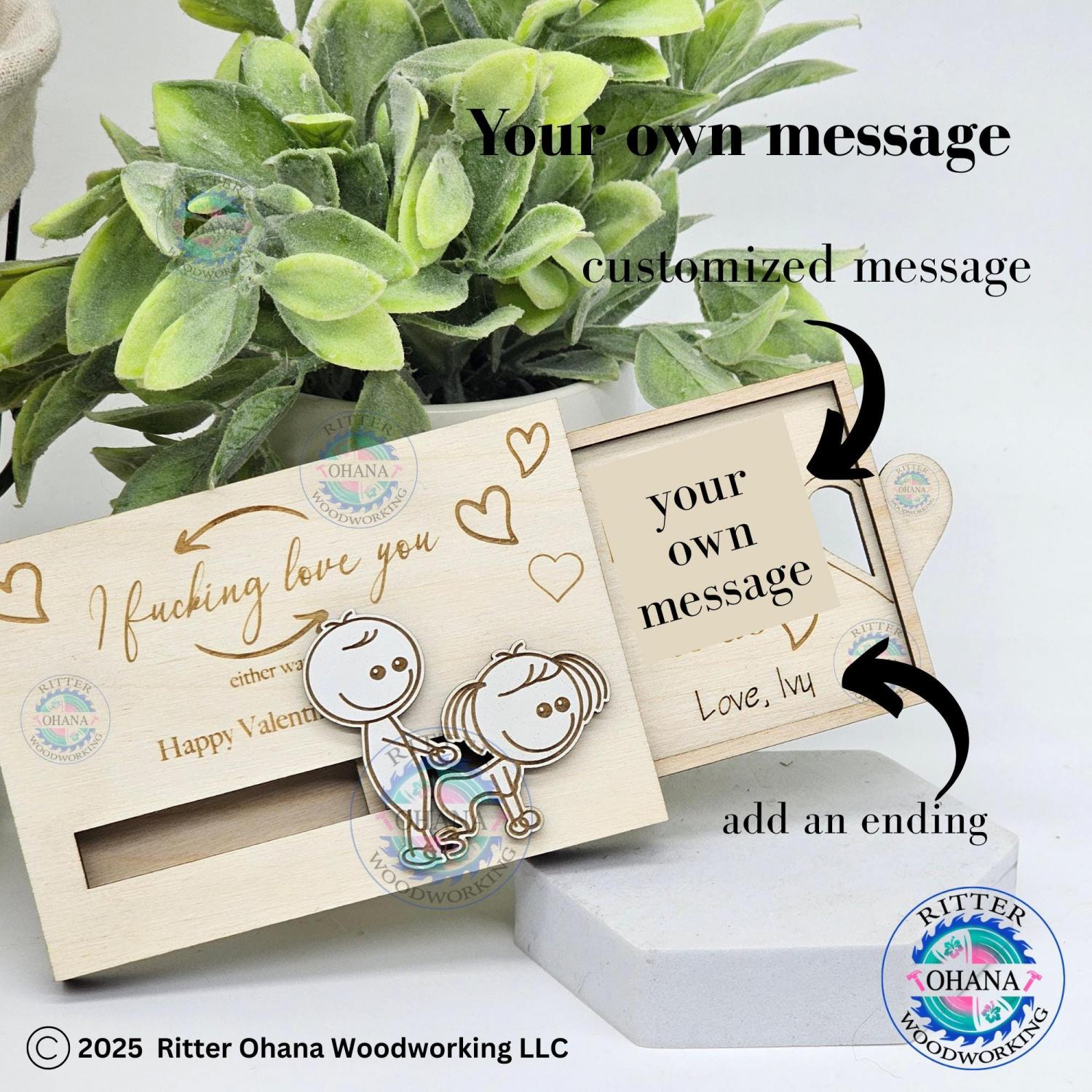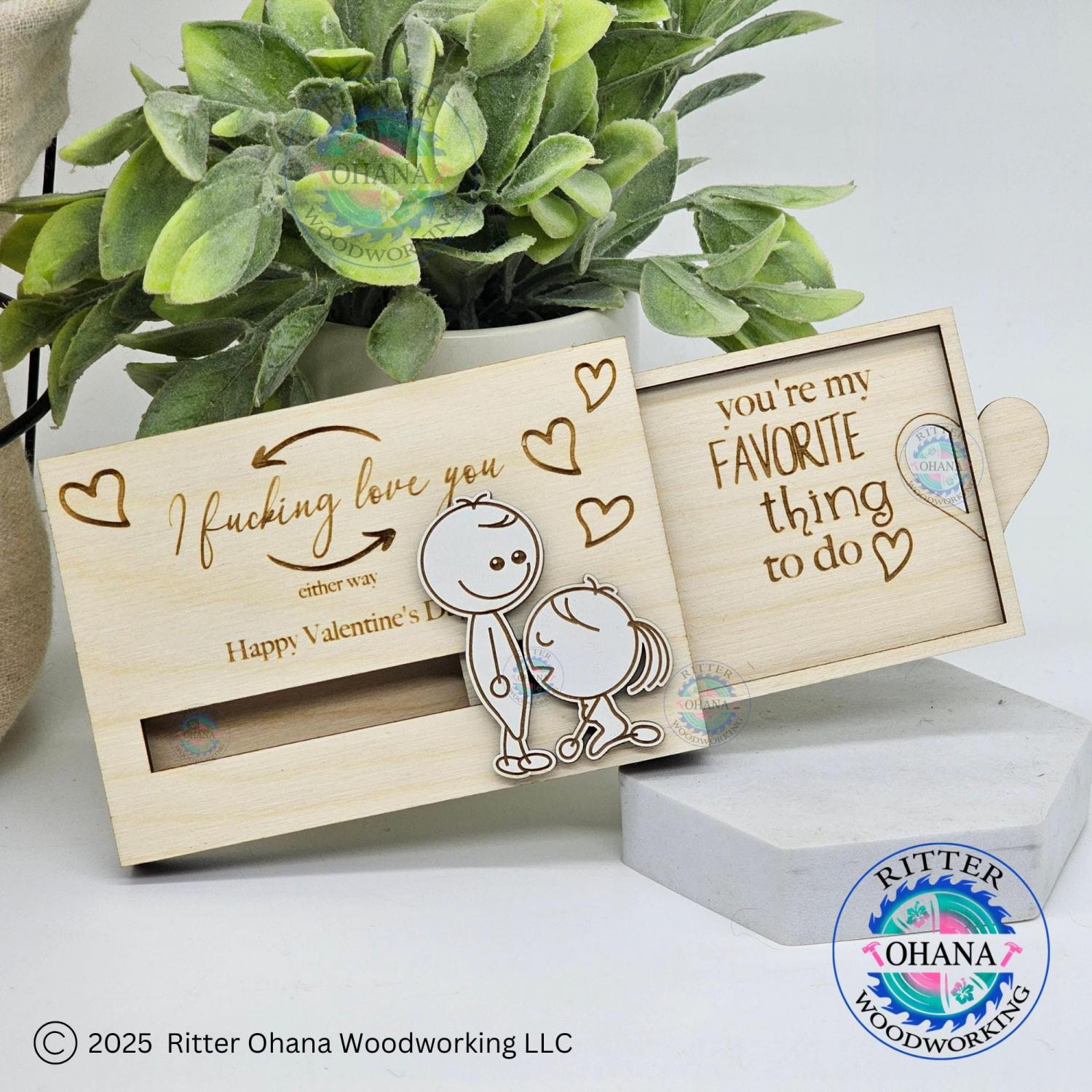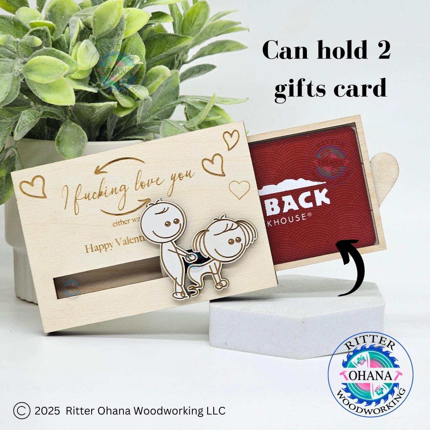 This "inappropriate" Valentine's Day gift card holder adds a touch of playfulness to your Valentine's Day gift with its unique design. This fun couple gift includes two sliding line drawing figures depicting a whimsical scene.